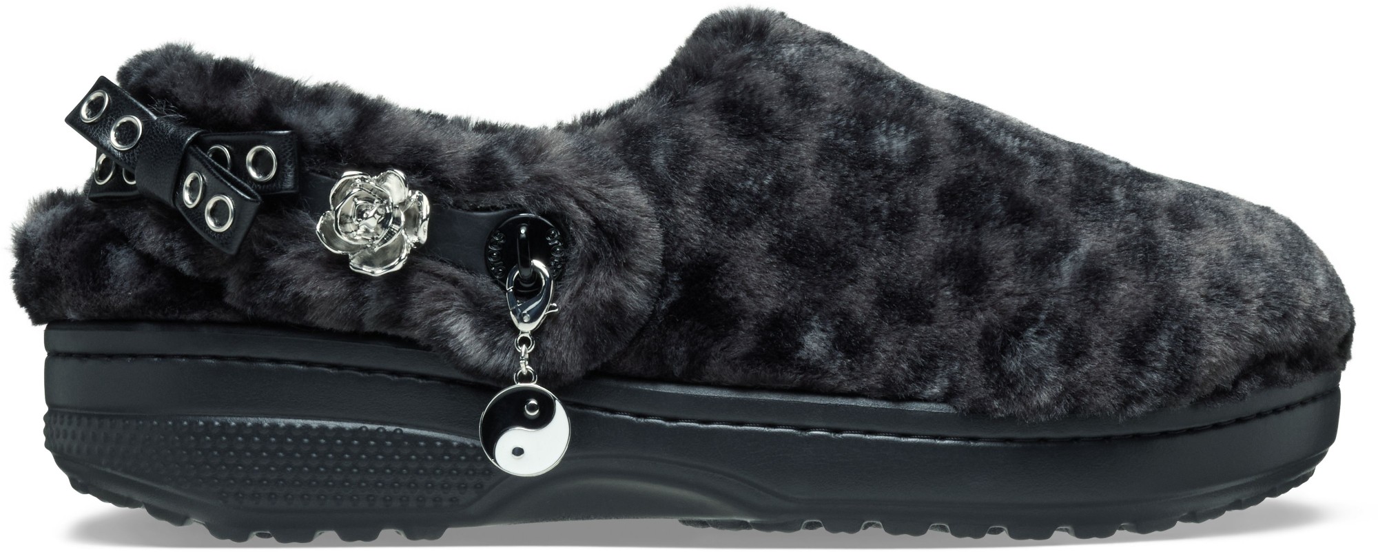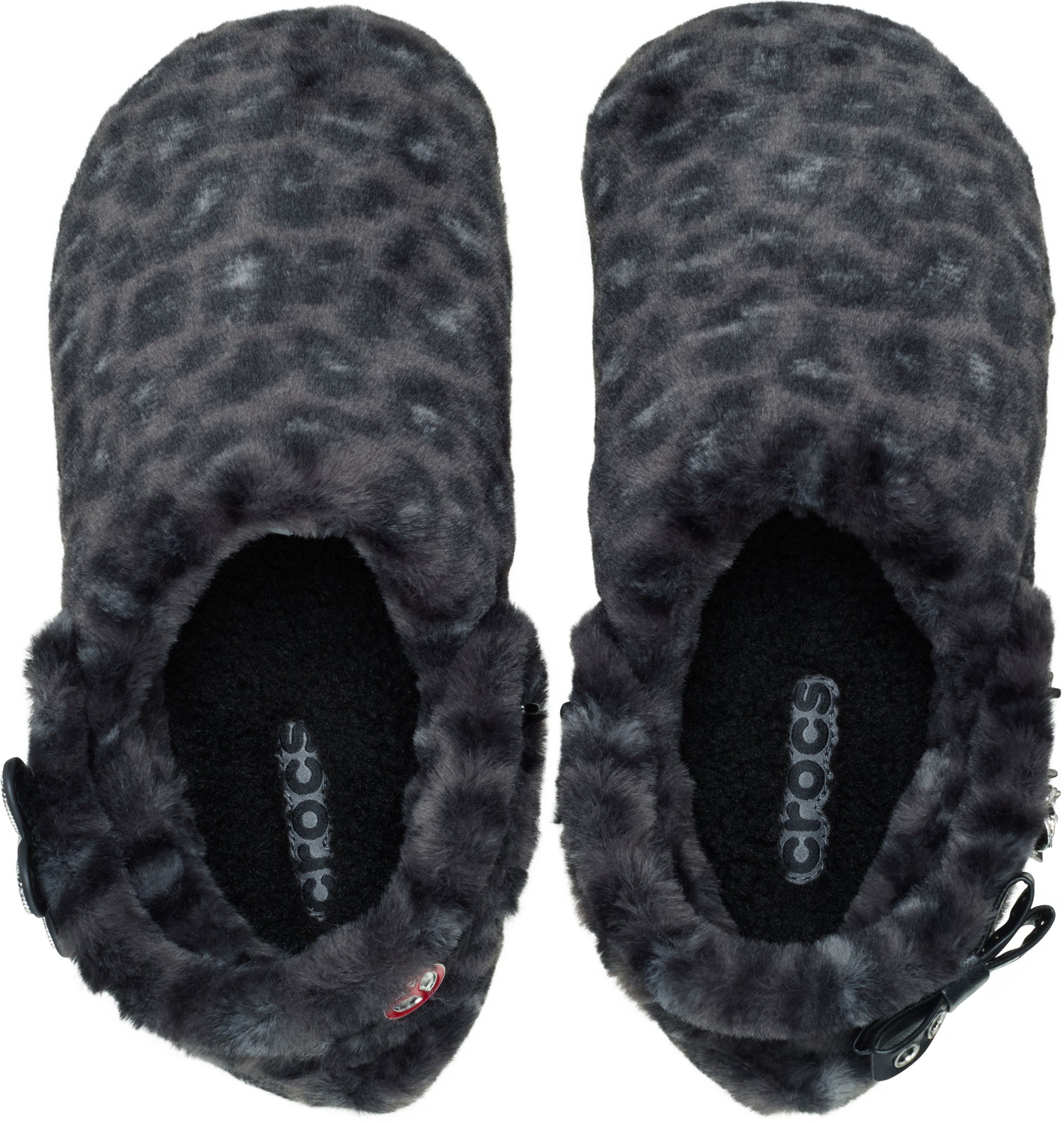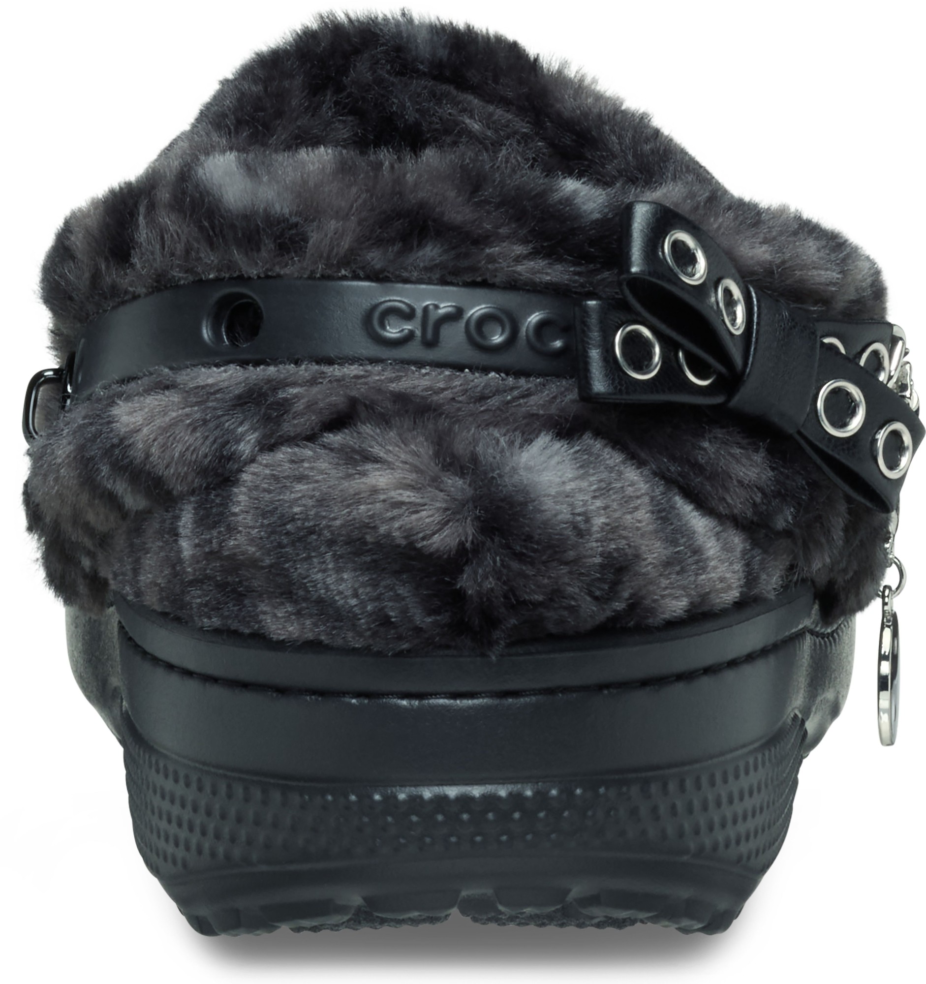 • Pivoting faux-fur backstrap with Jibbitz™ holes for personalization;