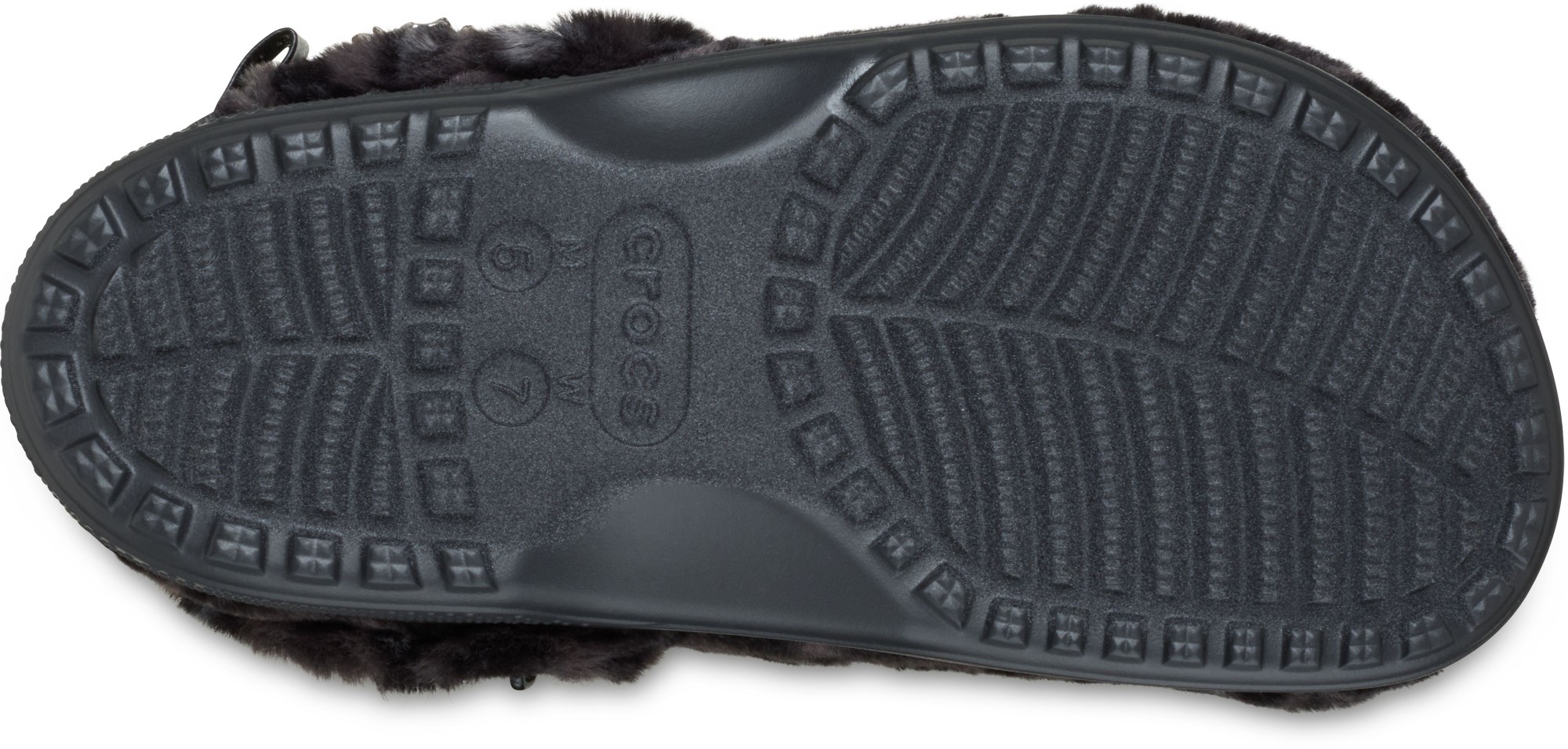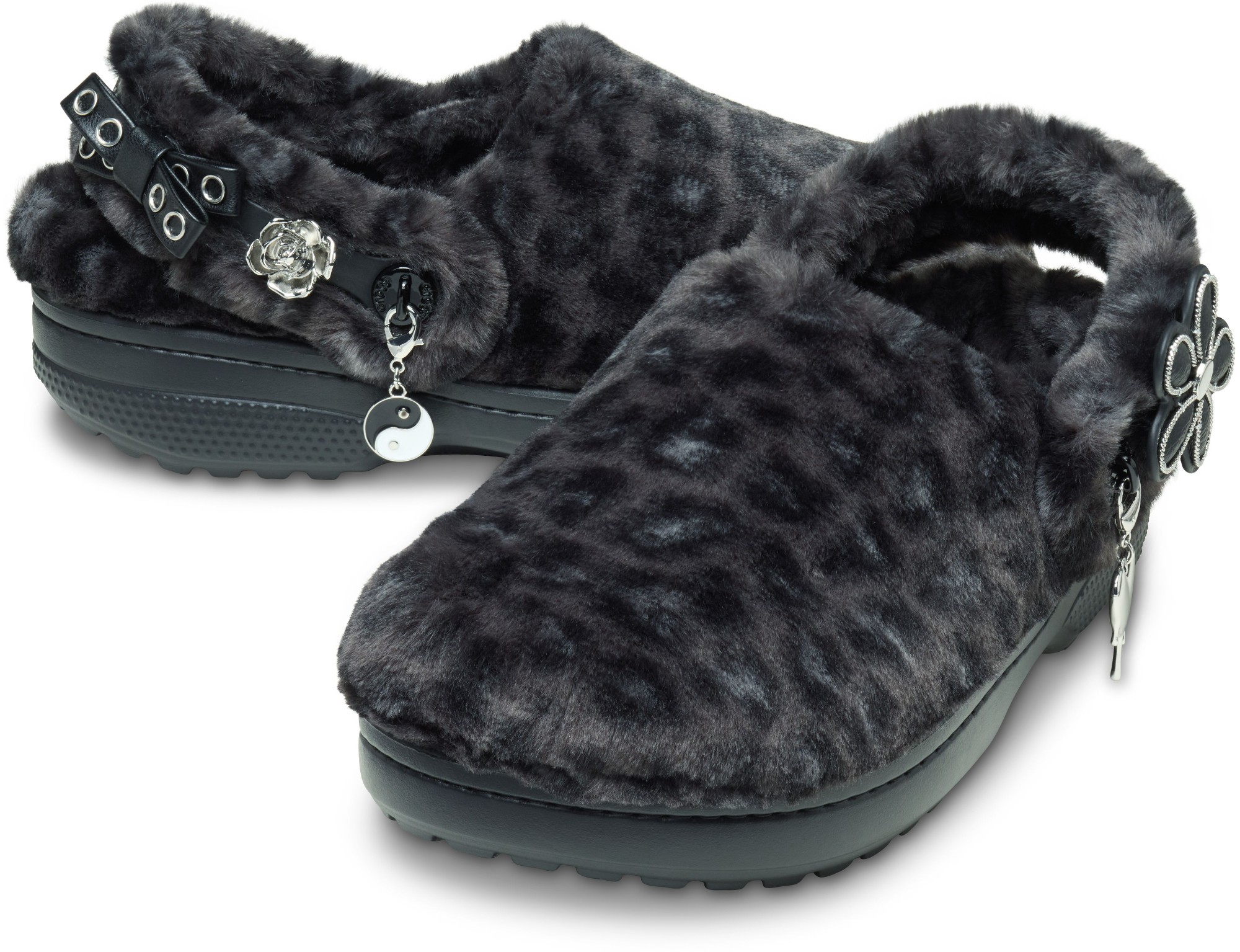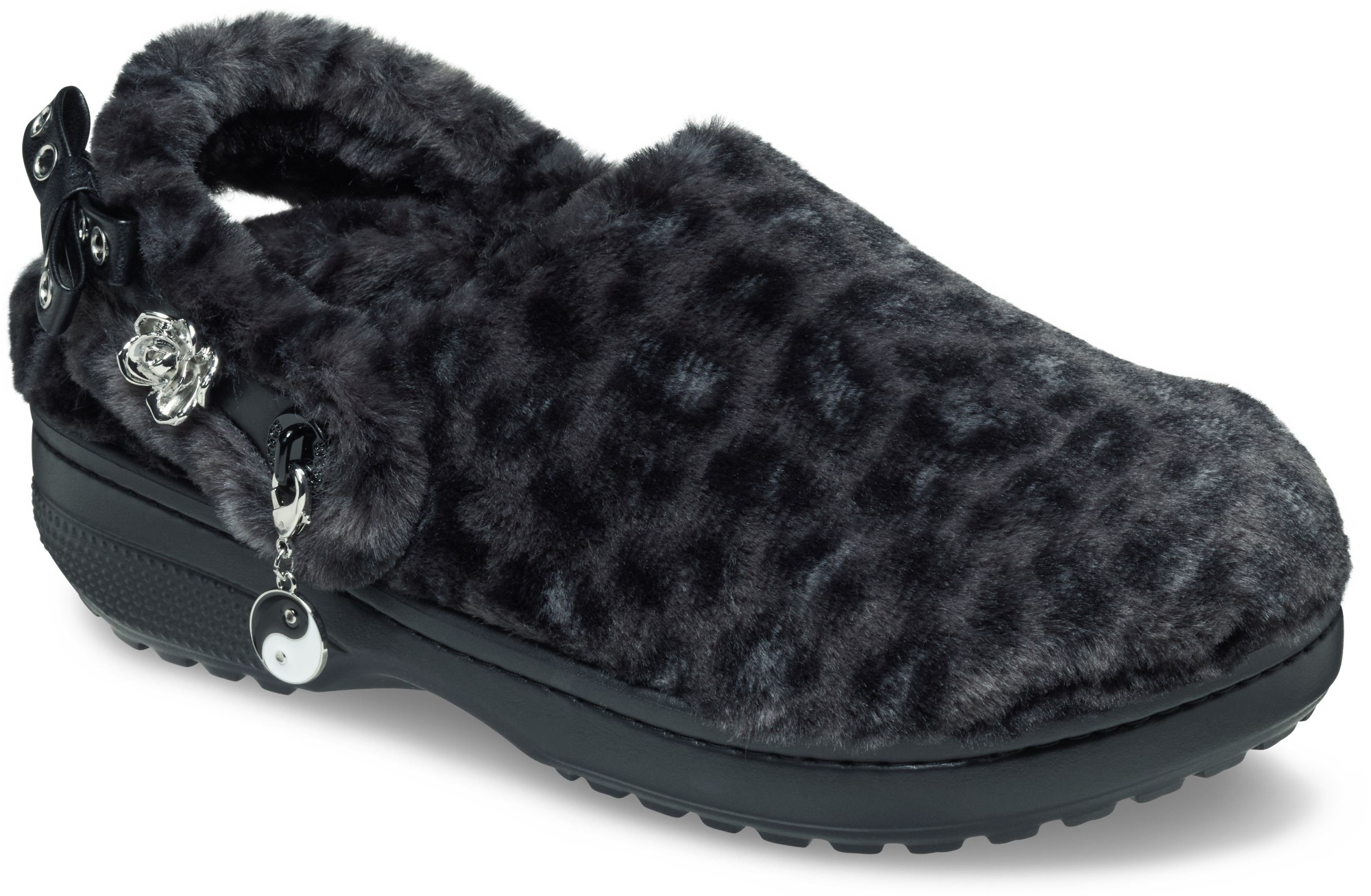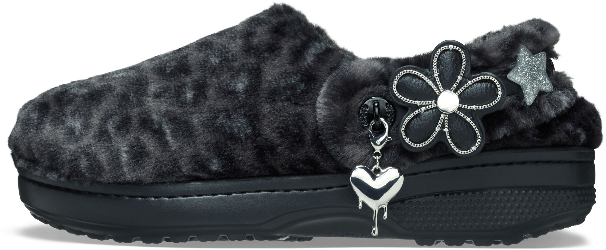 • Pivoting faux-fur backstrap with Jibbitz™ holes for personalization;
