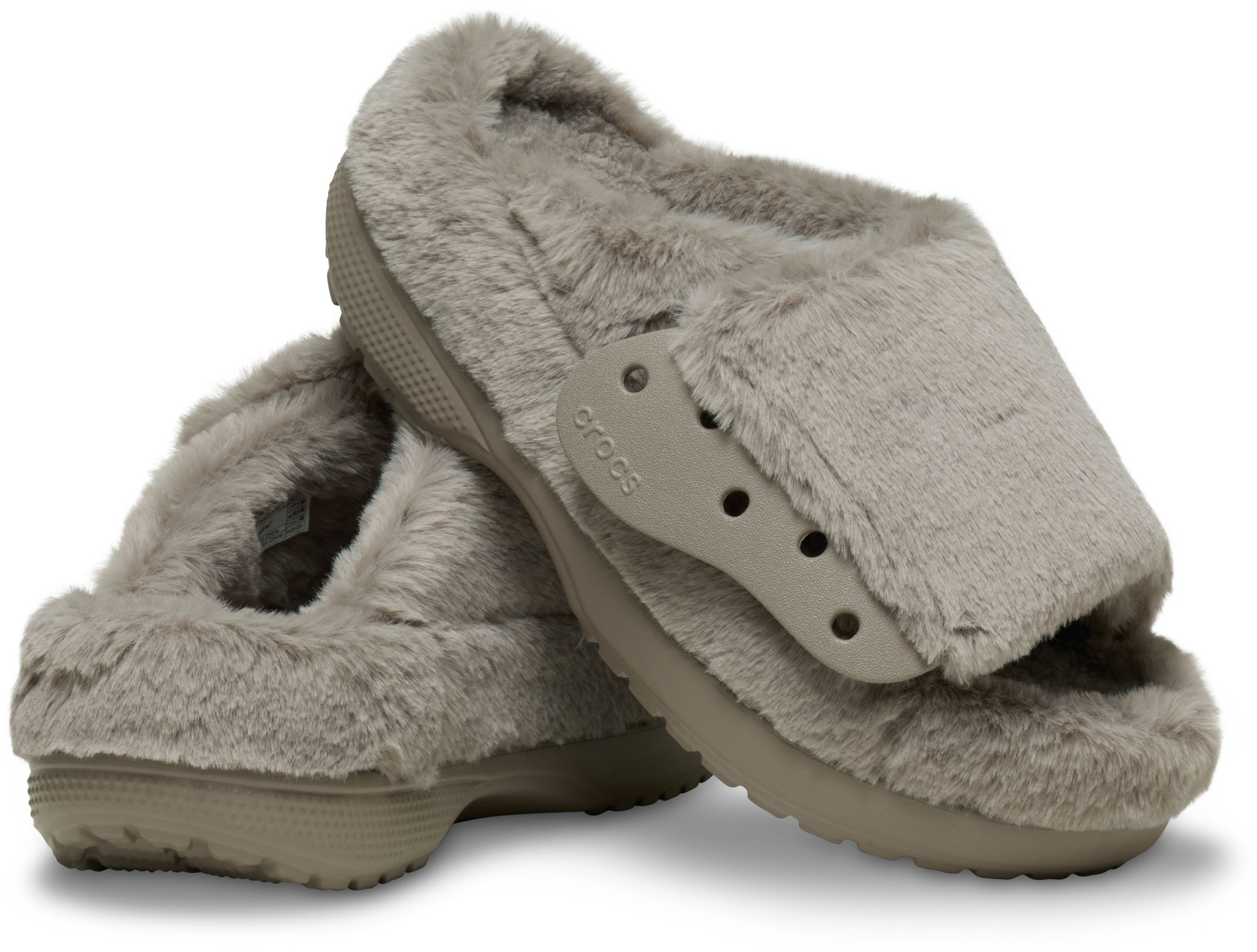 • Pivoting faux fur backstrap with Jibbitz™ holes for personalization;